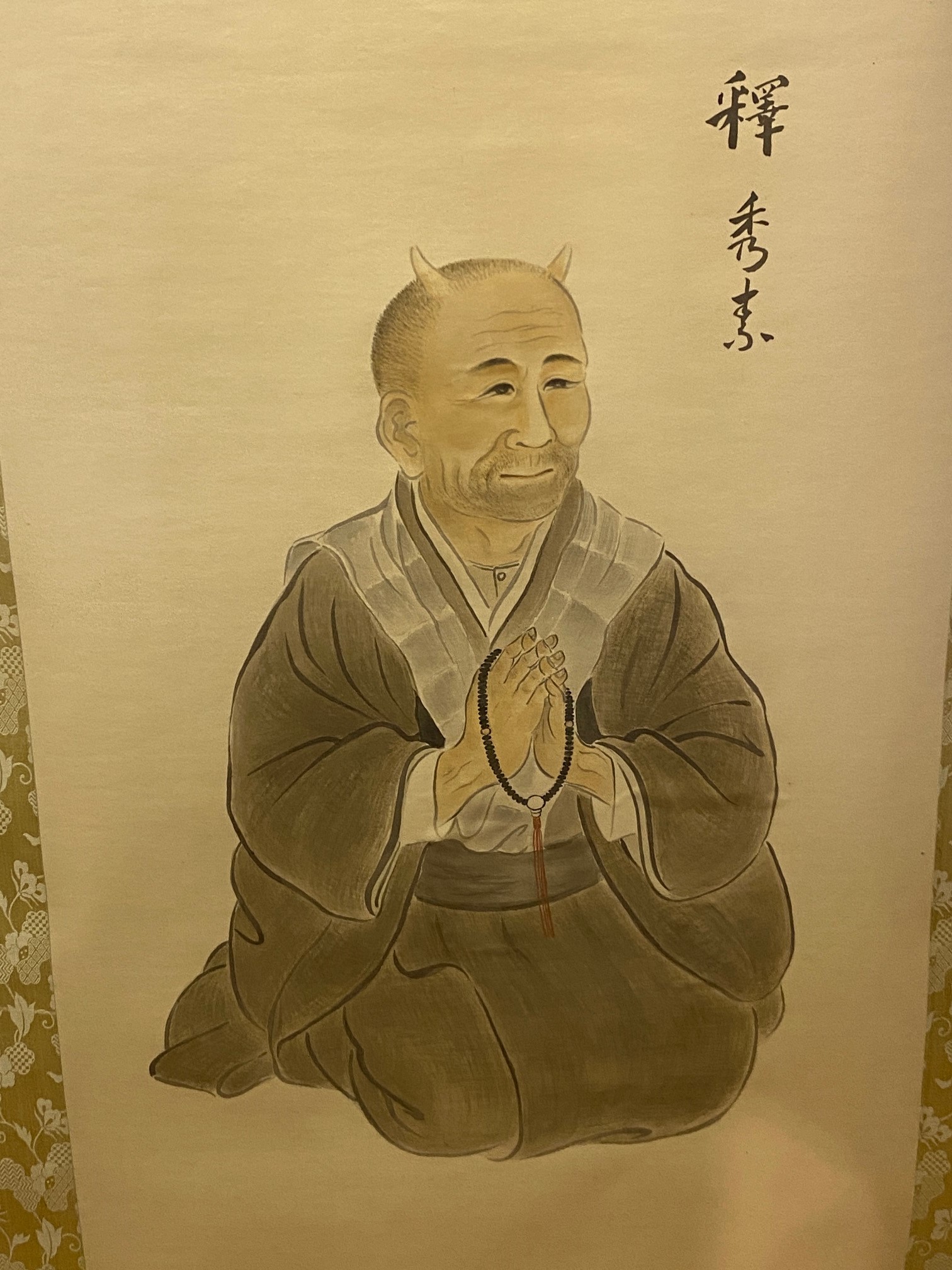 才市さん69歳ころの「口あい」ですが、この当時、大正7年から8年にかけてスペイン風邪が大流行して多くの方が感染して亡くなられた時期でした。この翌年、才市さんは「角の生えた肖像画」を描いてもらっています。どんなに聴聞していても、縁が整えば何をするか分からない、鬼の性分を持ったこの才市でございます。それが寺参りをさせていただいてます。と、お念仏に照らし出されたお姿です。