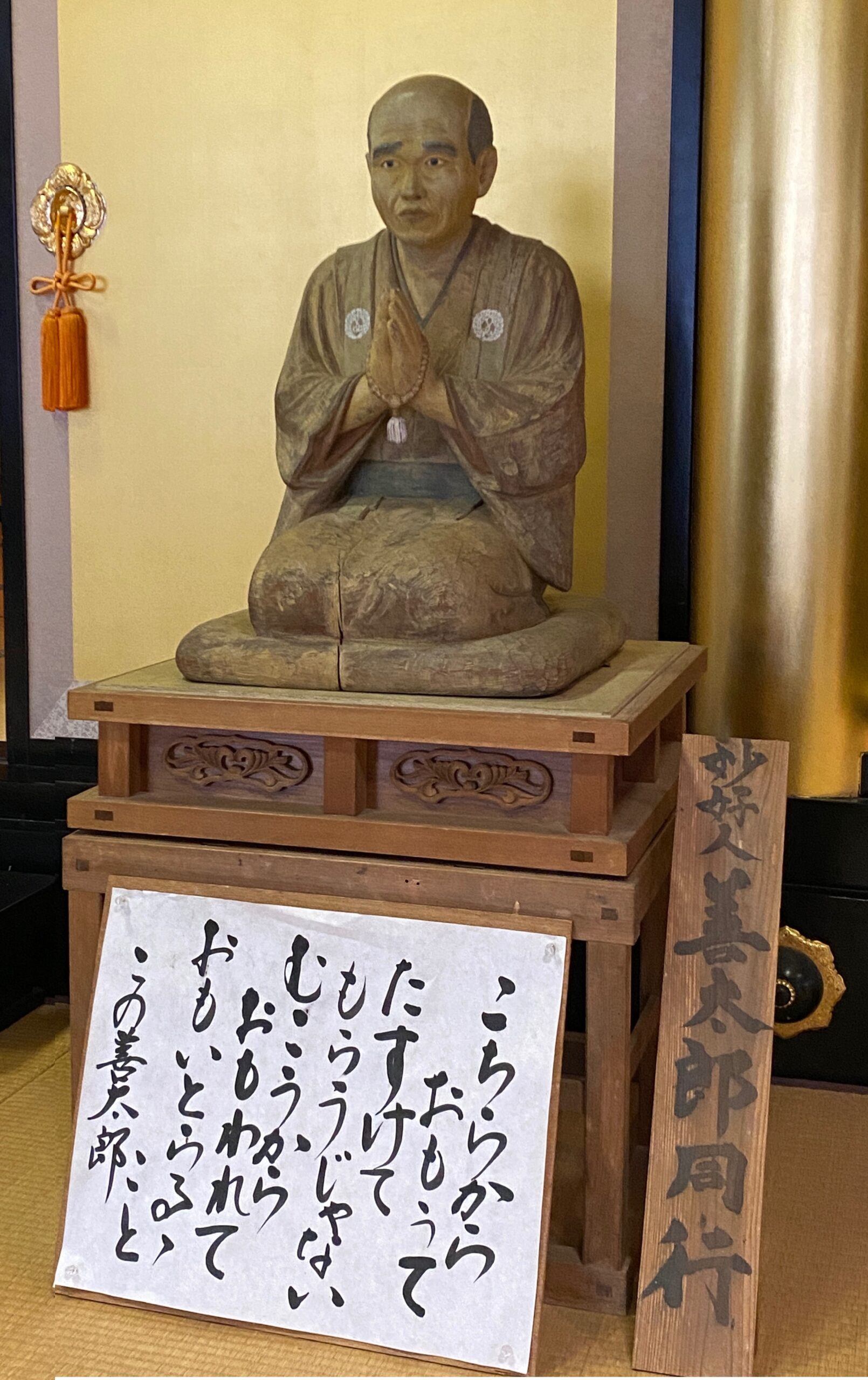 幼少時のお母さんとの別れ、また4人の娘たちとの度重なる死別という大きな悲しみが無ければ、お寺に行くこともなかったこの善太郎さんが今こうしてご法義に、阿弥陀様のお慈悲に救われたよろこびを柱に抱きつくという姿で表わされたのです。