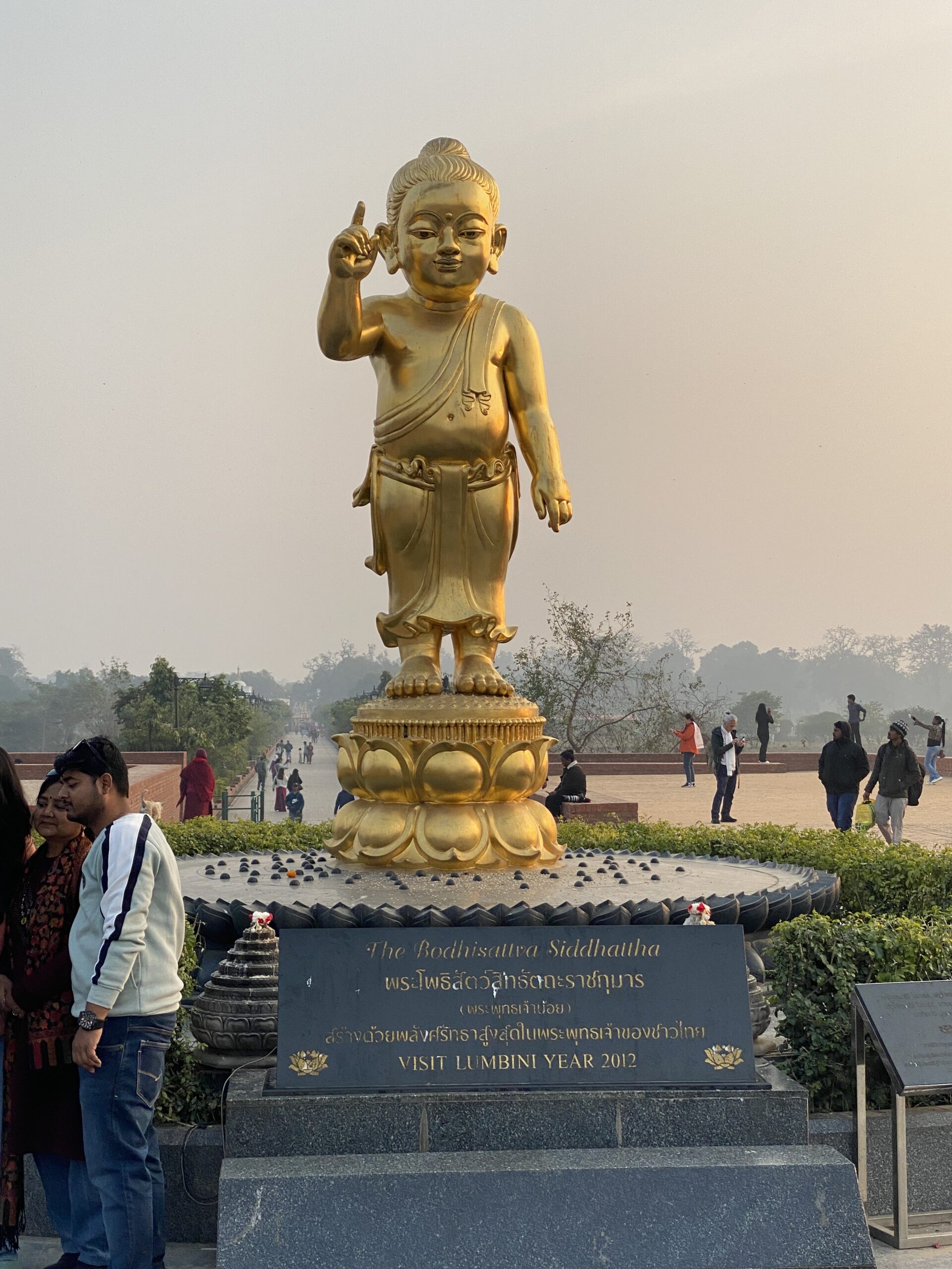 マーヤー堂へ向かう参道では、大きなお釈迦様の誕生仏が出迎えてくださいました。ちょうど西の空へ太陽が沈む時間帯で湖面に映るオレンジ色の太陽がたいそうおもむきがあり感動しました。