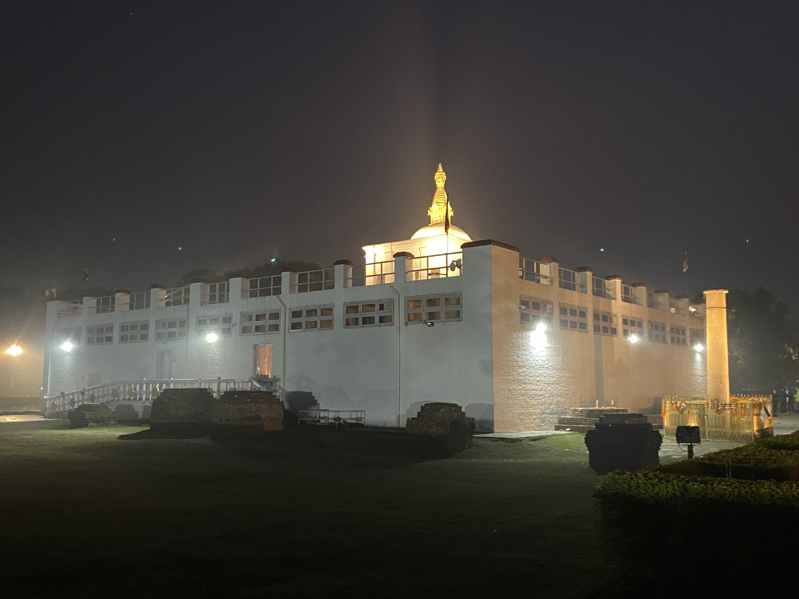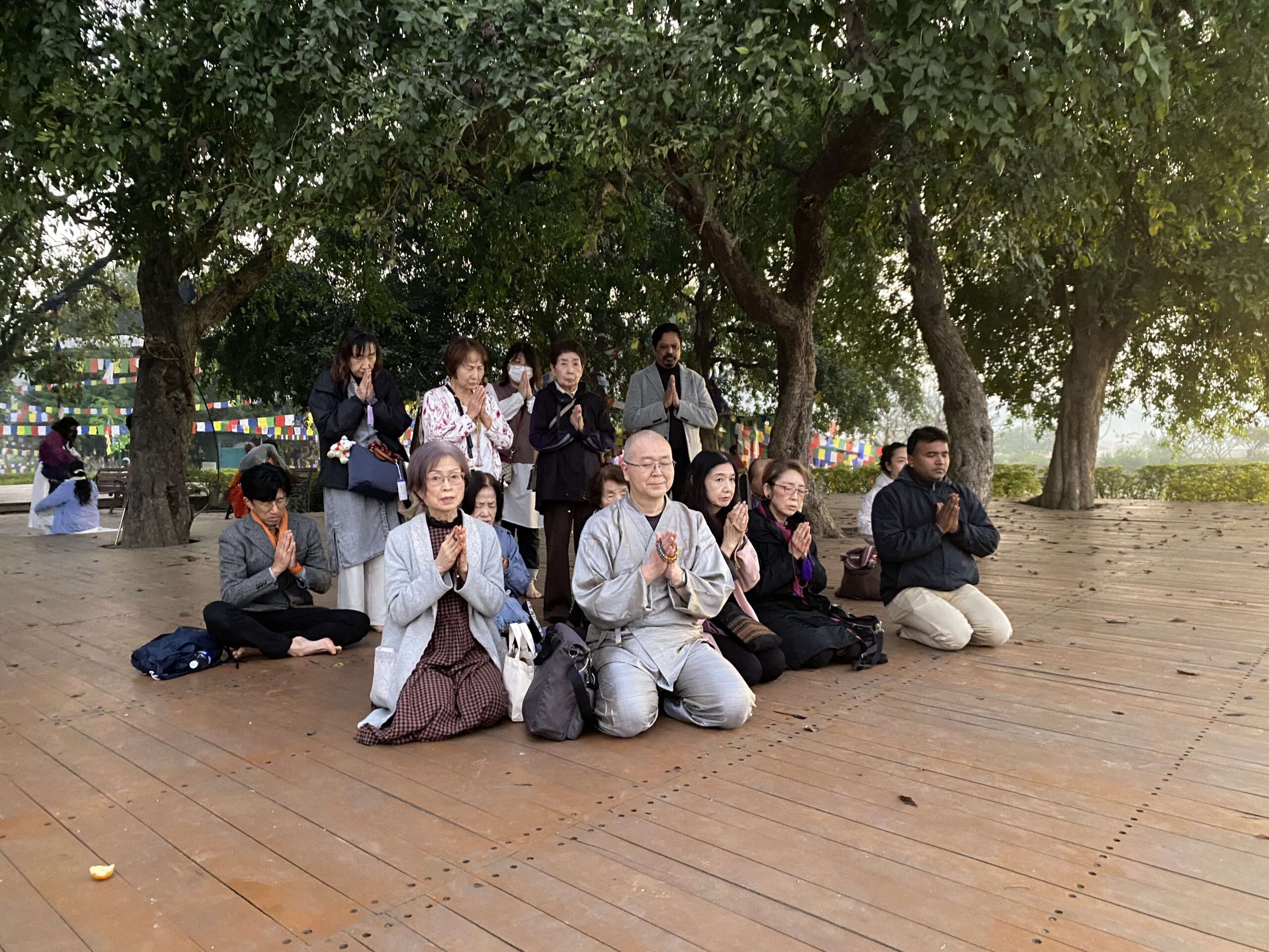 また、マーヤー堂横の池はプスカリニ池と言われ、マーヤー夫人が出産を前に沐浴し、お釈迦さまの産湯にも使われたといわれる池です。池のほとりには大きな菩提樹があり、巡礼者が瞑想をしたり、説法をしたりと思い思いに過ごしています。われわれ一行もそこでライトアップされたマーヤー堂に向かいおつとめをして、2500年前に思いを馳せ、お釈迦様も感じられたであろうルンビニの夜の風に吹かれながら静かな時間を過ごしました。