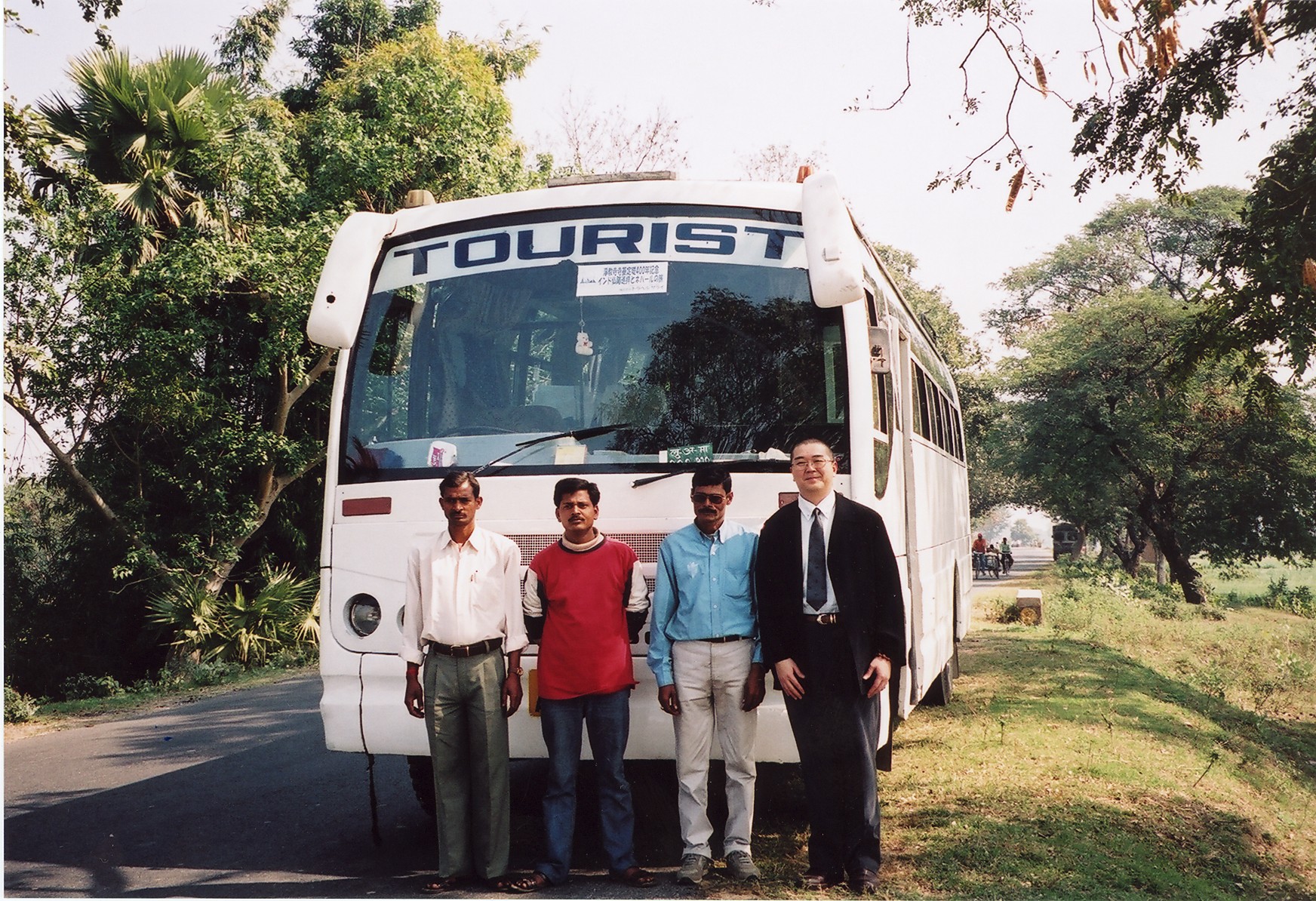 13:15 空港出発。13日のルンビニまでお世話になるバスはなかなか立派なバス(36人乗り?)で、室内もきれいだしシートも座り心地も良く、クーラーもよく効きました。(効きすぎて重ね着しないと寒いくらいでした。)(写真)とにかくクラクションを鳴らしっぱなしという感じ。日本でこんなことをしていたらかえって交通マヒ(喧嘩や苦情で)を起こすのではないかと思うほどでした。しかしよくよく見ますと車道と歩道の区別のない道で人が歩き、自転車が走り、輪タクというタクシーや牛が引く荷車や屋根まで人が乗っている乗り合いバスなどがひしめき合って走っている中でこのクラクションによって自分の存在を知らせているからこそ交通事故がないのだということを知りました。街中を外れると一面菜の花畑で緑の中に黄色の花が遥かかなたまで広がるという景色が延々と続く風景は感動です。