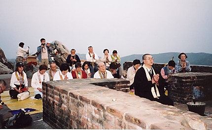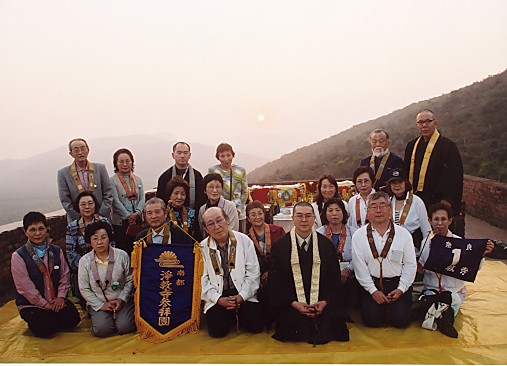 16:30 霊鷲山の麓に到着。土産物の露天が立ち、物売りが早速駆け寄ってまとわりついて「先生、先生」と、巧みな日本語で声をかけて菩提樹の実の数珠を買えとしきりに擦り寄ってくる。12年前に参加の地引さんいわく「この登り道(ビンビサーラロード)も前回は石がごろごろして歩きにくかったけれどもきれいな参道になって歩きやすくなっています。」とのこと。だんだんと登るにつれて周りが一面ジャングルであることがわかる。100年前に大谷探検隊がこの場所を発見したときにはトラが出るような危険なジャングルであったということもよくわかる気がした。途中で息のあがる方もおられて、普段から歩くことが大切と(目標は1日1万歩)教えられました。毎日歩き、月に2〜3回「歩こう会」で10`くらい歩いてる方はお元気でした。足から弱るといわれますがその通りだと思いました。阿難尊者と舎利弗尊者の瞑想された洞穴をお参りして、いよいよ山頂へ。幅の広い立派な階段が出来て20段ほど登ると頂上は畳20畳位の広さでしょうか。靴を脱いで整理してくれる現地の人がいました。お参りするところはコの字型にレンガが積まれ正面にお花がたくさん供えられ真ん中に香炉がありお線香が焚かれていました。黄色のビニールシートが敷いてあってそこに正座して夕日の今まさに沈もうとする光景を目にしながら皆さんと一緒に「仏説無量寿経、讃仏偈」をお勤めしました。